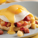 3 Tbsp. oil 2 c. ORE-IDA Potatoes O'Brien 1/2 c. chopped OSCAR MAYER CARVING BOARD Slow Cooked Ham 1 can (10-3/4 oz.) condensed cheddar cheese soup 2 Tbsp. milk 2 English muffins, split 4 eggs, poached